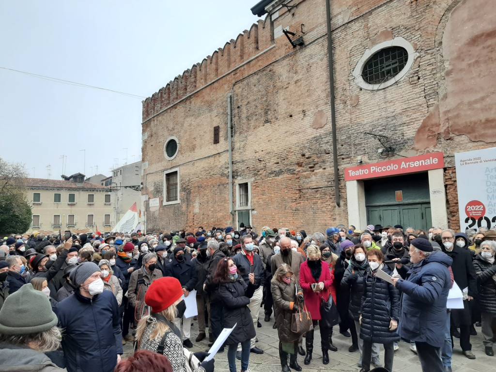 Presidio del FFA il 6 febbraio 2022 davanti all’ingresso del Teatro Arsenale in Campo della Tana.