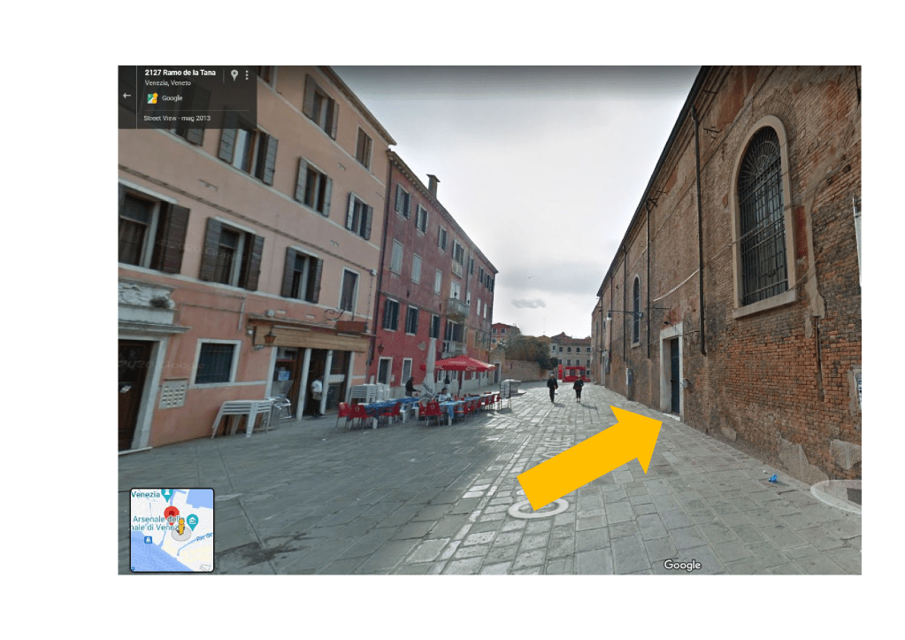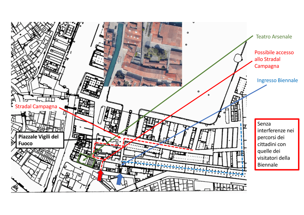 Esiste uno spazio tra il Teatro dell’Arsenale e l’ingresso “Duca degli Abruzzi” alla Biennale che permette di collegare Campo della Tana con il Piazzale dei Vigili del Fuoco, oltre il muro merlato di cinta dell’Arsenale.