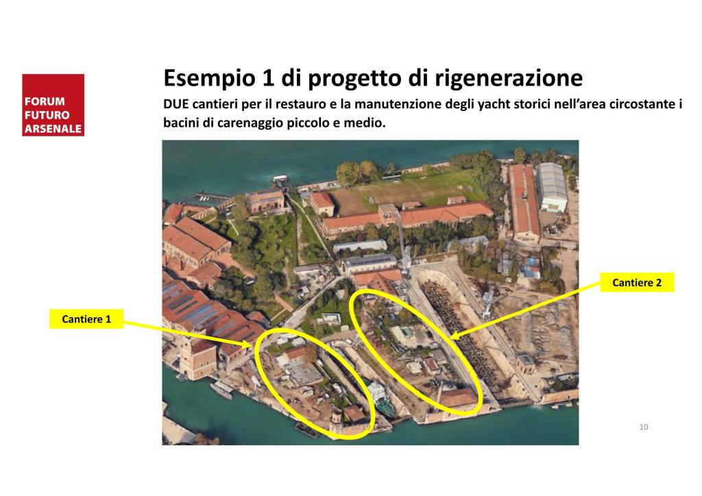 Poichè per rigenerare l’Arsenale Nord e innescare la trasformazione di tutto l’Arsenale servono progetti e una visone basata sulla storia e sullo stato dell’Arsenale, il Forum Futuro Arsenale ha ricordato i 5 progetti proposti al Sindaco nel 2017 (liquidati come mere “idee”) e illustrato altri 5 progetti per insediare all’Arsenale Nord nuove attività permanenti, in linea con la storia e la vocazione del luogo, che lo rendano un polo produttivo vivace e slegato al turismo.